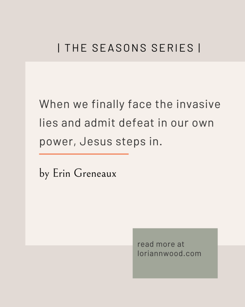 The Holy Spirit pointed to the weeds of sin growing unchecked in my soul, weeds I had overlooked in my vigor to serve others and help them grow. God dug up the depths of my heart, and it wasn’t pretty. The largest culprit was pride, and the reality of its rampant growth was oppressive. Selfish desires trailed under every thought and action. The process of uprooting it was overwhelming, and I was powerless to wrangle this infestation on my own.